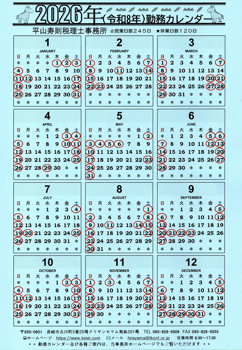 ※基本的に日曜日と祝祭日は休業日です。土曜日は月によっては業務を行っていますので、ご都合に合わせてご連絡ください。